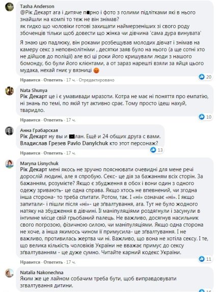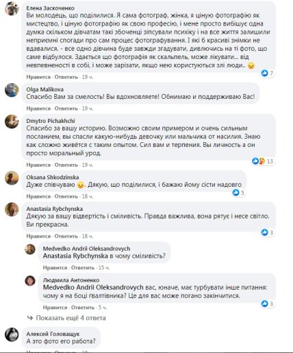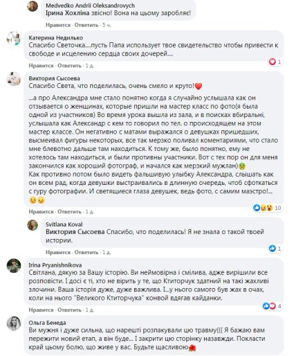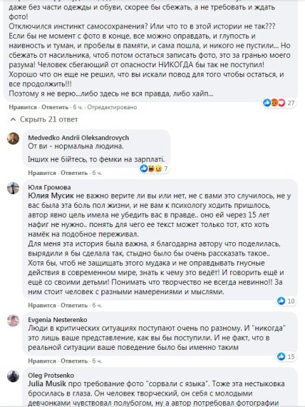Сомневаются, что в рассказе чистая правда, без вымысла. Но приводят свои примеры, из которых понятно, что все мы разные и огромную роль в этом играет воспитание, характер и сама ситуация. Возможно, теперь появятся и другие женщины, которых фотограф принуждал к сексу не 10 лет назад, а совсем недавно, и эти эпизоды добавят доказательной базы делу «украинского Вайнштейна»? По крайней мере, в соцсети уже появился хэштег #ЖертвиКтитора.
