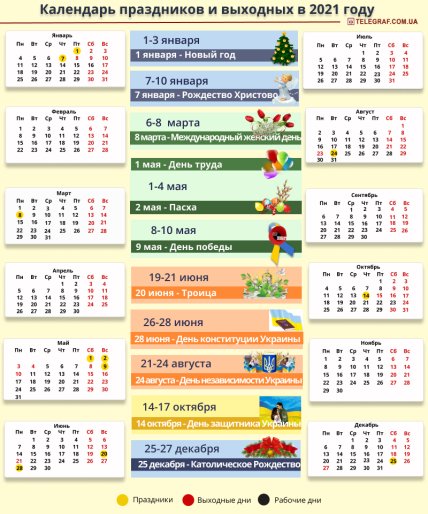 В 2021 году украинцев традиционно ждет немало государственных и религиозных праздников, которые принесут с собой также дополнительные выходные дни.