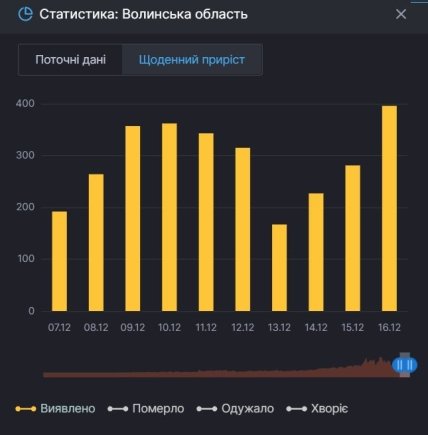 Антирекордсменом по числу новых случаев стала Волынская область. Утром 16 декабря в регионе прирост COVID-19 составил 396 человек. Прежде, за последние дни, самым высоким числом в области было 362 случая.
