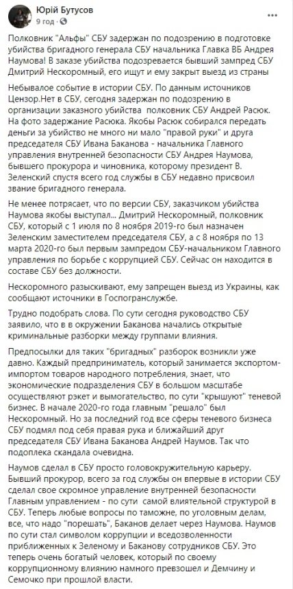 О фигурантах известно следующее. Андрей Наумов - начальник Главного управления внутренней безопасности СБУ, бывший прокурор и чиновник, которому президент Владимир Зеленский недавно присвоил звание бригадного генерала. Дмитрий Нескоромный - полковник СБУ, который с 1 июля по 8 ноября 2019 года был назначен Зеленским заместителем главы СБУ, а с 8 ноября по 13 марта 2020 года был первым заместителем СБУ - начальником Главного управления по борьбе с коррупцией СБУ. Сейчас он находится в составе СБУ без должности.