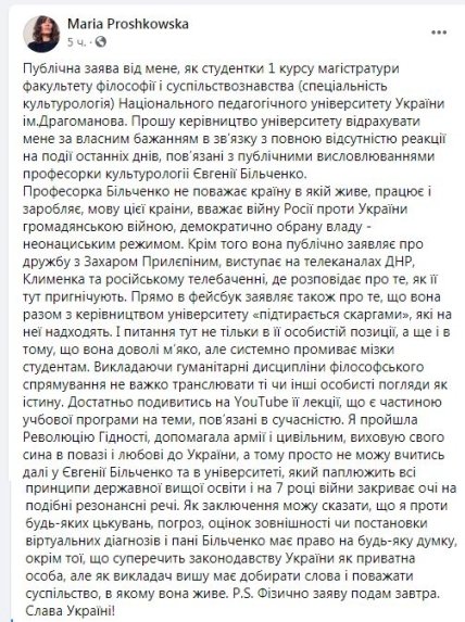 "Профессор Бильченко не уважает страну в которой живет, работает и зарабатывает, язык этой страны, считает войну России против Украины гражданской войной, демократически избранную власть - неонацистским режимом. Кроме того она публично заявляет о дружбе с Захаром Прилепиным (российский политик, поддерживающий боевиков ОРДЛО, - ред.), выступает на телеканалах "ДНР", Клименко и российском телевидении, где рассказывает о том, как ее здесь угнетают. Прямо в Фейсбук заявляет также о том, что она вместе с руководством университета "подтирается жалобами", которые на нее поступают", - написала она.
