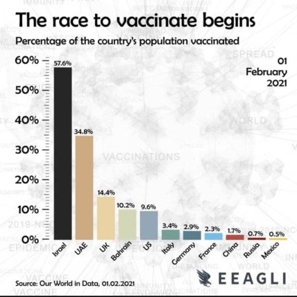 Процент вакцинации населения от COVID-19 в разных странах мира на 1 февраля