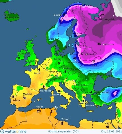 Ближайшей ночью в Украине ожидается -7...-14°, на северо-востоке -15...-22°, на юге и западе -3...-9 на Закарпатье около нуля. Днем 18 февраля в северных областях -7...-14°, на остальной территории -2...-7°, на юге -2...+3°, на Закарпатье и в Крыму +1...+5°.