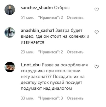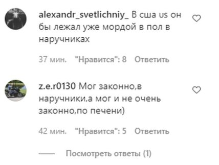Под видео появилось множество комментариев, где пользователи пишут о мерах наказания в таких случаях. А также о том, что в США его бы уже арестовали за такое оскорбление сотрудника полиции при исполнении: