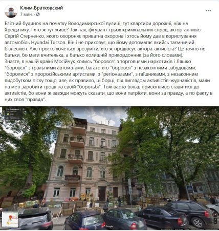 В свою очередь, известный адвокат Клим Братковский отметил, что Сергей Стерненко живет в элитном доме на ул. Владимирской, где "квартиры дороже, чем на Крещатике" и назвал активиста "актером".