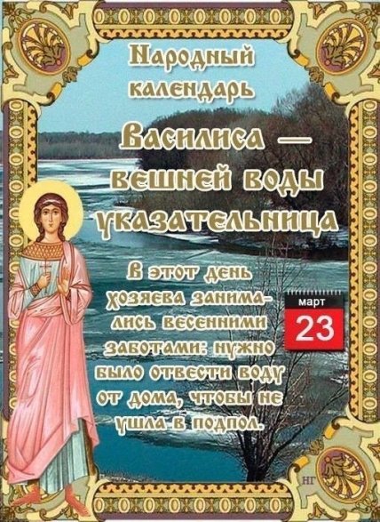23 марта 2021 года (по старому стилю – 10 марта) православная церковь чтит память святой Василисы. В народном месяцеслове дата получила название Василиса – вешней воды указательница.
