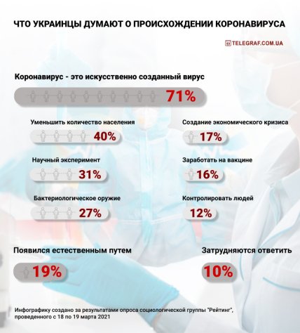 При этом, из тех, кто считает "корону" созданным 31% уверены, что его создали с помощью научного эксперимента, 27% считают вирус биологическим оружием, а 40% оружием с целью сокращения количества населения Земли.