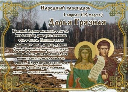 1 апреля православная церковь почитает память мучеников Хрисанфа и Дарии. А в народном календаре дата получила название Дарья - грязные проруби, Дарья-пролубница, грязнопролубка, поплавиха.