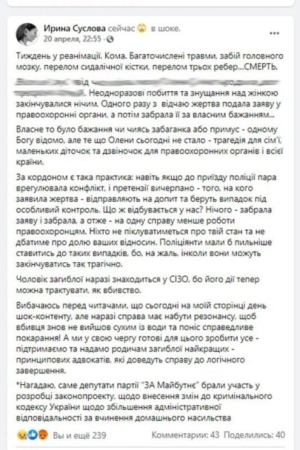 Информация о гибели 34-летней черновчанки появилась в ленте Фейсбука с подачи лидера Женского движения "За майбутнє" Ирины Сусловой, узнавшей о беде от одного из сообществ Черновцов, а те – от мамы несчастной женщины.