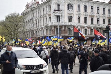 "Нацкорпус" анонсировал "Марш защитников Одессы" на полдень. Начался он от Соборной площади - то есть от того места, где расположен и Дом профсоюзов. После марша прошел митинг в парке Шевченко.