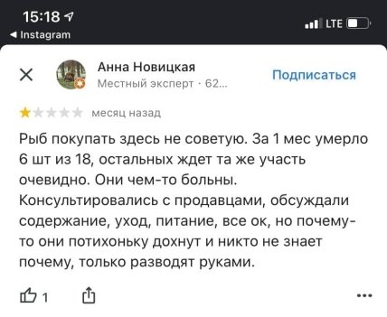 "Рыб покупать здесь не советую. За 1 месяц умерло 6 из 18, остальных ждет та же участь, очевидно. Они чем-то больны. Консультировалась с продавцами, обсуждали содержание, уход, питание – все ок, но почему-то они потихоньку дохнут, и никто не знает почему, только разводят руками".