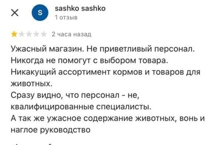 "Ужасный магазин. Неприветливый персонал. Никогда не помогут с выбором товара... Сразу видно, что персонал – неквалифицированные специалисты. А также ужасное содержание животных, вонь и наглое руководство".
