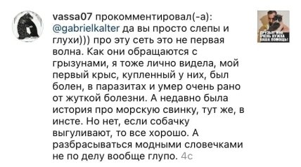 "Да вы просто слепы и глухи. Про эту сеть это не первая волна. Как они обращаются с грызунами, я тоже лично видела. Мой первый крыс, купленный у них, был болен, в паразитах и умер очень рано от жуткой болезни".