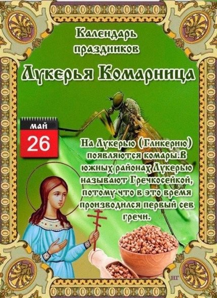 26 мая православная церковь вспоминает Гликерию Ираклийскую и Гликерию Новгородскую. В народном календаре дата получила название Лукерья-комарница, потому что, по приметам, 26 мая появляются комары.