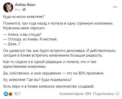"Как-то сидела я в одной редакции и поняла, что я там единственная киевлянка. Да, собственно, и мое окружение — это на 80% приезжие. Ау, киевляне! Где вы? Куда подевались?", - написала она в Фейсбук.