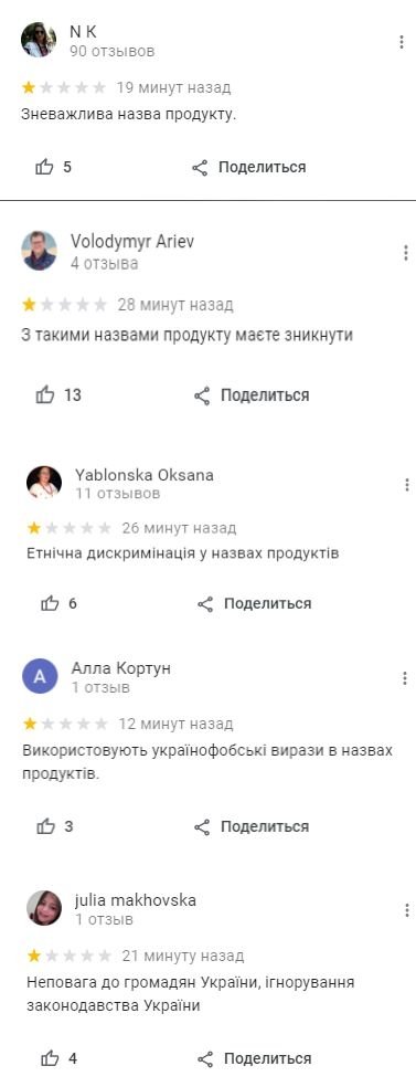 В комментариях пользователи выразили возмущение в сторону производителя из-за пренебрежительного названиея продукта, этнической дискриминации и украинофобских выражений.