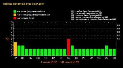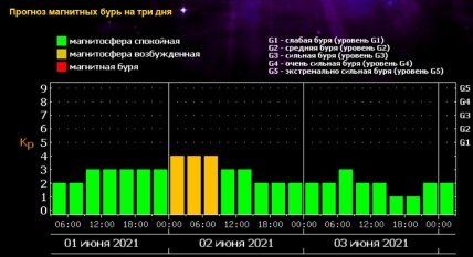 Единственная магнитная буря в июне ожидается в среду 16 июня, а также небольшие геомагнитные всплески возможны 2, 3, 17 и 26 июня.