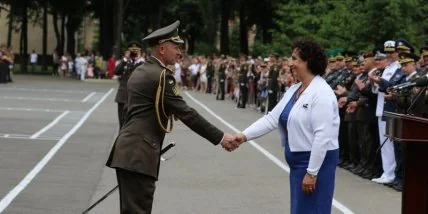 "Посол Великобритании в Украине Мелинда Симмонс вручает Британскую почетную саблю лучшему выпускнику Института государственного военного управления при Университете обороны Украины", - говорится в подписи к видео, размещенном в Фейсбук посольства.