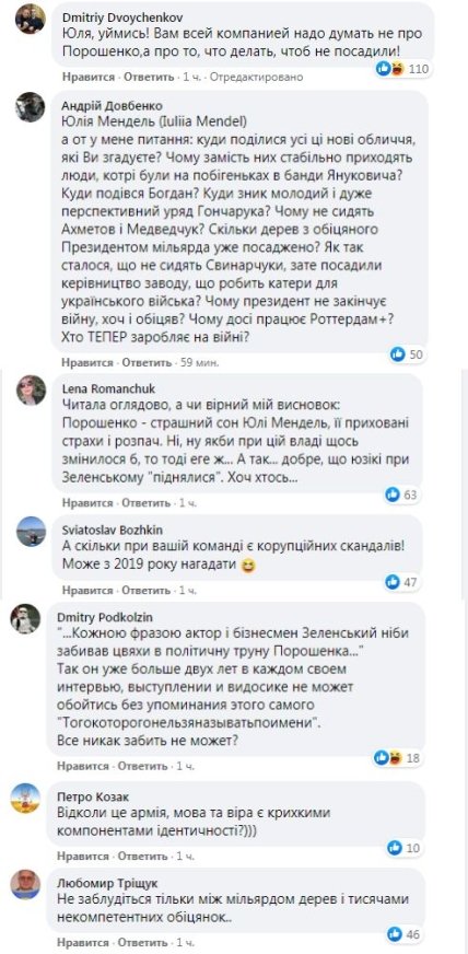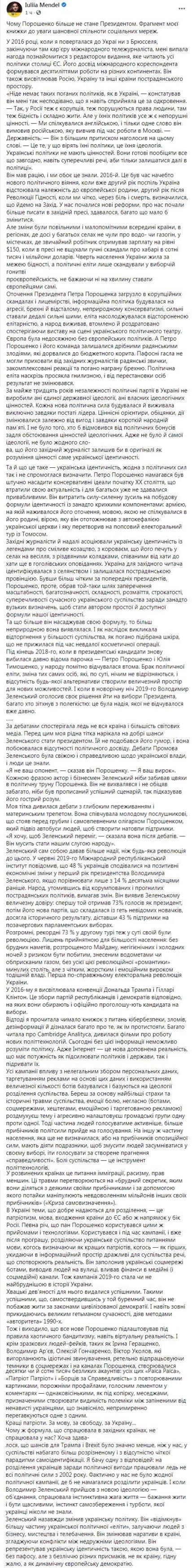 Большую часть поста Мендель посвятила критике работы тогдашнего президента Порошенко и его окружения, которых она назвала "мелкими советскими ворами, которые дорвались до бюджетного корыта". Самого экс-президента она упрекнула в стремлении навязать украинцам "консервативные идеалы начала ХХ века, которые потеряли свою актуальность".