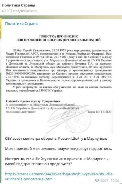 "Интересно, если Шойгу согласится приехать в Мариуполь, какой вид транспорта он предпочтёт?", - повторили вопрос в телеграм-канале издания "Страна".