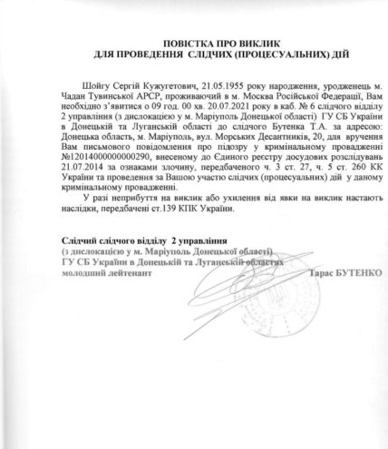 Теперь российскому министру необходимо приехать 20 июля в Мариуполь и явиться в местный следственный отдел.