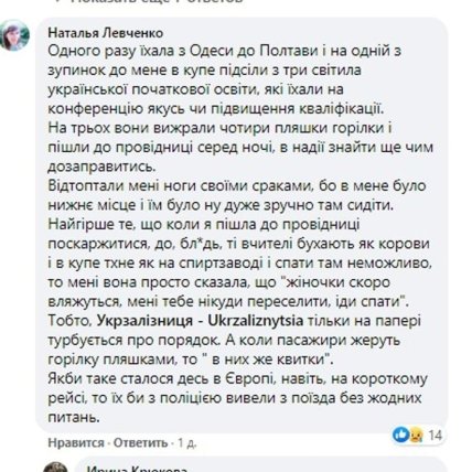 "Вы очень смелая! Я вам аплодирую. Мне было 20, и ко мне сексуально домогался мужик, что сел во Львове на поезд №82. Проводница отморозилась, хотя видела, что он ходит в стрингах(!) в купе. По словам проводницы я должна была "на свой страх и риск" сама(!) найти свободную полку, и сама(!) "договориться с пассажирами, которые зайдут в 2 ночи".