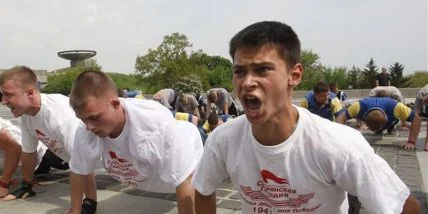 Более 700 человек на площади Свободы одновременно выполняли физические упражнения по отжиманию.