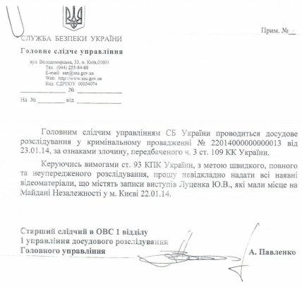 СБУ начала собирать информацию о публичных выступлениях экс-министра Юрия Луценко. Служба безопасности обратилась к средствам массовой информации с просьбой предоставить все имеющиеся записи выступлений политика перед широкой публикой на Майдане. Такой запрос опубликовал на своей странице в Facebookжурналист Мустафа Найем.