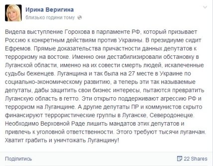 Веригина пишет о том, что "Луганщина и так была на 27-м месте в Украине по социально-экономическому развитию, а теперь эти так называемые депутаты, дабы защитить свои бизнес-интересы, пытаются превратить Луганскую область в гетто".