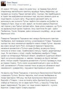На своей странице в Facebook народный депутат Олег Ляшко напомнил о том, что ровно 100 лет назад, 28 июня 1914 года, в Сараево был убит наследник австрийского престола эрцгерцог Франц Фердинанд, что фактически привело к началу Первой мировой войны. Ляшко утверждает, что в данный момент в Украине происходят поистине эпохальные события, которые влияют как на Европу, так и на весь мир. По словам политика, "если большие демократии мира не помогут нам остановить Путина и отразить его агрессию на Донбассе и вернуть Крым, если мы сами, наконец, не начнем реально бороться, мир погрузится в пучину третьей мировой войны. Ведь совершенно очевидно, что Путин не удовлетворится одной Украиной, ему захочется идти дальше - страны Балтии, Грузия, Молдова, страны бывшего соцлагеря - до новой Берлинской стены".