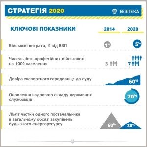 Кроме того, доверие к суду должно составлять не менее 60% населения и экспертного сообщества, обновление кадрового состава чиновников должно охватить не менее 70% от общего количества госслужащих, а количество граждан, довольных уровнем жизни, до 2020 года должно составлять 90% от всего населения Украины.