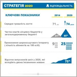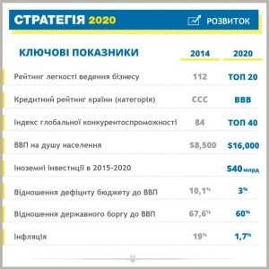 Согласно обнародованным данным, "Стратегия-2020" включает около 60 реформ и специальных программ, реализация которых позволит Украине войти в Топ-20 стран в рейтинге Всемирного банка по легкости ведения бизнеса, увеличить ВВП на душу населения до 16 тысяч долларов против нынешних 3900 долларов по версии рейтингового агентства Standard & Poor's, а также увеличить за пять лет приток прямых иностранных инвестиций до 40 млрд долларов против нынешнего показателя в среднем 4-5 млрд долларов в год.