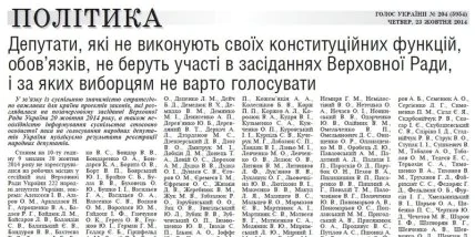 Список появился в номере за четверг под заголовком "Депутаты, которые не выполняют свои конституционные функции, обязанности, не принимают участия в заседаниях Верховной Рады, и за которых избирателям не стоит голосовать".