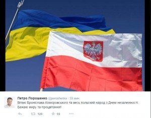 По случаю Дня независимости Польши, Президент Украины Петр Порошенко отправил поздравительные слова президенту Польши Брониславу Коморовскому по случаю национального праздника - Дня независимости Польши. В поздравлении отмечается, что украинская сторона искренне радуется достижениям Польши, которая прошла долгий и сложный путь развития и стала современным демократическим европейским государством, благодаря совместному порыву польского народа, национальному единению и стойкости духа.