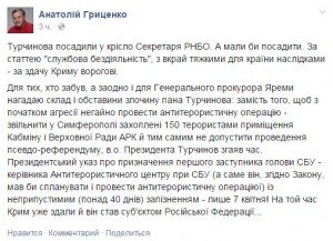 "Для тех, кто забыл, а заодно и для Генерального прокурора Яремы напомню состав и обстоятельства преступления господина Турчинова: вместо того, чтобы с началом агрессии немедленно провести антитеррористическую операцию - освободить в Симферополе захваченные 150 террористами здания Кабмина и Верховной Рады АРК, и тем самым не допустить проведения псевдо-референдума, и.о. Президента Турчинов упустил время", - отметил Гриценко.