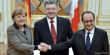 Петр Порошенко, канцлер Германии Ангелы Меркель и президент Франции Франсуа Олланда проводят расширенное заседание.