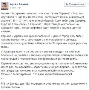 "Читаю - Захарченко заявляет, что хочет "взять Харьков" - "Нас там ждут люди. У нас там много своих. Когда будет нужно, они возьмут оружие".. !! => Х**ло с припаянной башкой. Хрен тебе, а не Харьков. Ждут мол его «свои» в Харькове.. Ждут, таки да – в тюрьме на Холодной горе.. Топаз например ждет, тоскует в камере, другие «ваши»..", - написал в своем Фейсбуке Аваков.