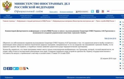 Напомним, в МИД РФ отметили, что "... высказывание секретаря СНБО Украины А.В.Турчинова о том, что украинская власть якобы готовится к реализации некоторых закрытых военно-технических ядерных программ, направленных то ли на создание так называемой "грязной" бомбы, то ли ядерного оружия. Как правило, о подобных планах заявляют разного рода террористические группировки".