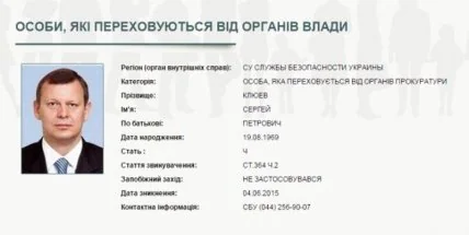 Народный депутат Сергей Клюев был объявлен в розыск Службой безопасности Украины - такая информация появилась на официальном сайте МВД. Так, в рубрике "Розыск", в подкатегории "Лица, скрывающиеся от органов власти", значится о том, что СБУ объявила Клюева в межгосударственный розыск - по информации правоохранителей он исчез 4 июня и теперь скрывается от органов прокуратуры.