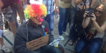 У дверей суда харьковского мэра встречали переодетые клоунами активисты.