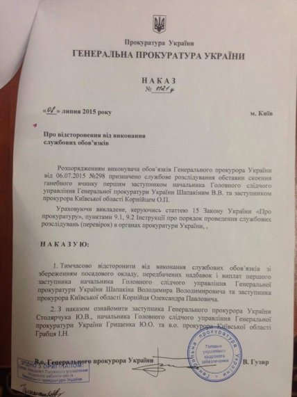 Нардеп опубликовал приказ за подписью заместителя генпрокурора Владимира Гузыря. Шапакин и Корниец всего лишь временно отстранены от исполнения обязанностей… с сохранением «должностного оклада, предусмотренных надбавок и выплат».