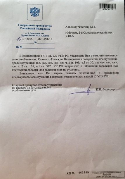 Он также сообщил, что защита получила заявление Генпрокуратуры о территориальной подсудности дела Надежды Савченко: "Вчера по почте получили заявление Генеральной прокуратуры по поводу территориальной подсудности дела Савченко".