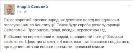 "Пошел жесткий прессинг народных депутатов перед понедельниковым голосованием по Конституции. Также будет попытка раскола фракции "Самопомич". Предлагают деньги, должности, перспективы и т.д.", — написал А.Садовый на своей странице в Фейсбук в субботу.