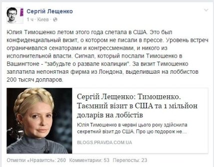 Депутат пишет, что за визит лидера "Батькивщины" заплатила непонятная фирма из Лондона. Всего на американских лоббистов она выделила 200 тысяч долларов.