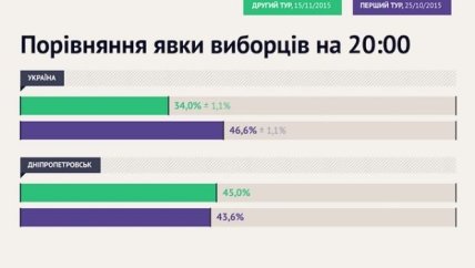 По данным наблюдателей гражданской сети ОПОРА, общенациональная явка избирателей по состоянию на 20:00 15 ноября составила 34%.