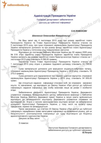 "В соответствии с постановлением Кабинета министров Украины от 30 июня 2015 года №518 "О заработной плате президента Украины" заработная плата президента Украины зависит от размера заработной платы премьер-министра Украины и по состоянию на 1 ноября 2015 года составляет 9 тыс. 296 грн. Заработная плата главы администрации президента Украины по состоянию на 1 ноября 2015 года согласно условиям трудового договора составляет 15 тыс. 758,6 грн", - сказано в документе, опубликованном в пятницу на сайте "Радио Свобода".