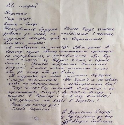 "Суд - фарс, приговор - блеф. Торговаться будут. Каждый будет хотеть урвать за меня как можно больше и ждать удобного случая, чтобы не потерять свою собственную марку", - пишет Савченко.