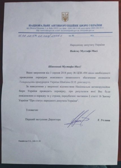 Об этом говорится в ответе НАБУ на обращение народного депутата Мустафы Найема (БПП).