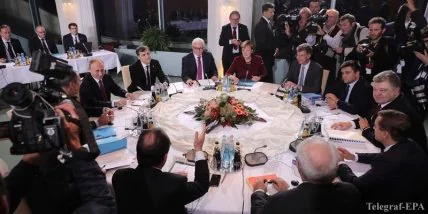 Как передает корреспондент агентства "Интерфакс-Украина", по состоянию на 22.30 среды (по Киеву) делегации стран во главе с канцлером ФРГ Ангелой Меркель, президентом Украины Петром Порошенко, президентом Франции Франсуа Олландом и президентом России Владимиром Путиным продолжают переговоры в ведомстве федерального канцлера Германии (Bundeskanzleramt).