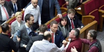 Во время рассмотрения законопроекта о Конституционном суде Украины перед голосованием произошла небольшая драка между народными депутатами И.Мельничуком и С.Лещенко по неизвестной причине.